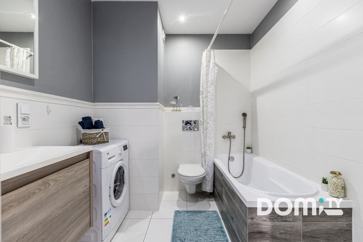 - łazienki w której znajduje się wanna z prysznicem i pralka